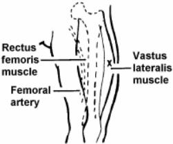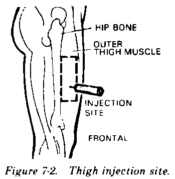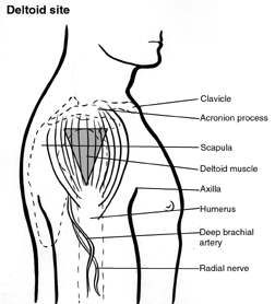 The most common muscle sites when injecting are as follows: Upper arm: Deltoid muscle, which forms the bulge just below the shoulder Thigh: Lateral border of the vastus lateralis muscle between the hip and knee Buttocks: Dorsogluteal muscle Hip: Ventrogluteal muscle Subcutaneous injections